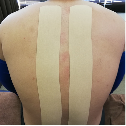 腰だけではなく背中全体でもOKです。写真の男の子(陸上部の学生さん)は身体が非常に大きいので、7.5cm幅のキネシオを使っています。実際に貼ってみると分かりますが、強力に背筋をサポートします。
