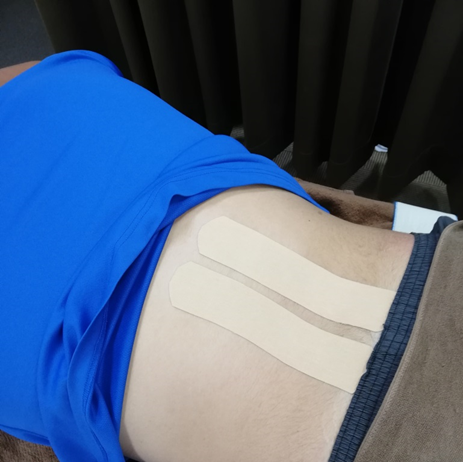 腰の可動性を上げるために、キネシオテープも有効です。キネシオの張力は筋肉と同じなので、かなりサポートしてくれます(左写真は5.0cmキネシオ)。
