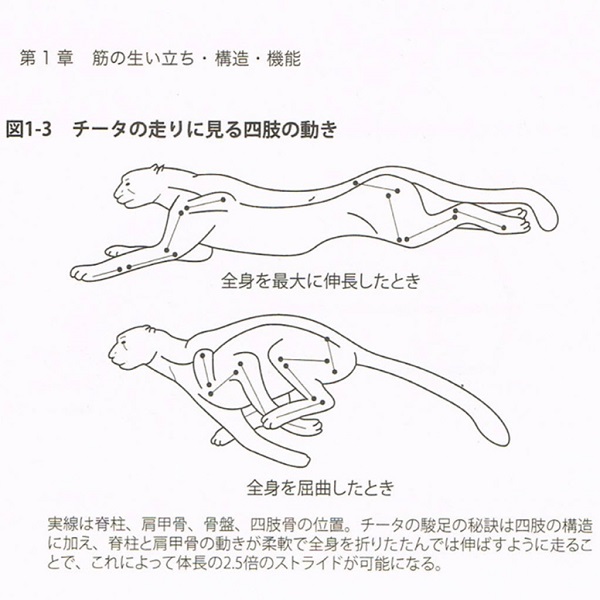 僕が好きなネコ科の動物チーターはとっても細いですが、走ると時速100㎞を超える世界最速の動物です。身体をムチのようにしならせ、背骨や肩・股関節の柔軟性と筋力をフルに生かす運動方法。僕が理想とするバランス能力や体幹力はチーターの様な、しなやかな筋力を好きな時に爆発させられるイメージ。(※参照:筋肉学入門、著石井直方)