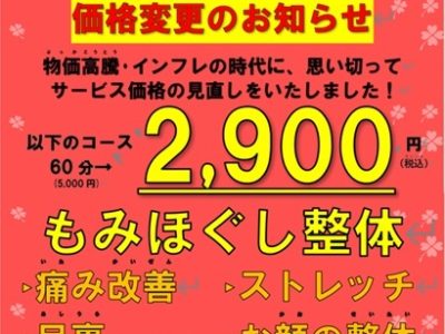 こんにちは店長トミゾウです。最近の物価高、電気代の高騰などホント大変ですよね… そこで日頃お世話になっているお客様へ感謝の気持ちを込めて、整体な […]