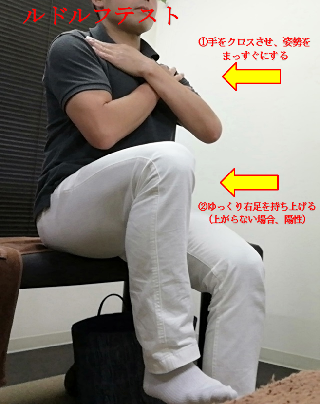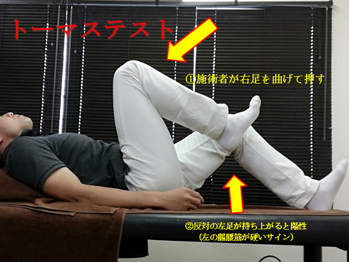 下半身の柔軟性がない人も腰痛は出ます。写真は『尻上がり現象』といって、大腿四頭筋や腸腰筋の柔軟性がない人に陽性反応が出ます。(※陽性=ダメ、陰性=問題なし)