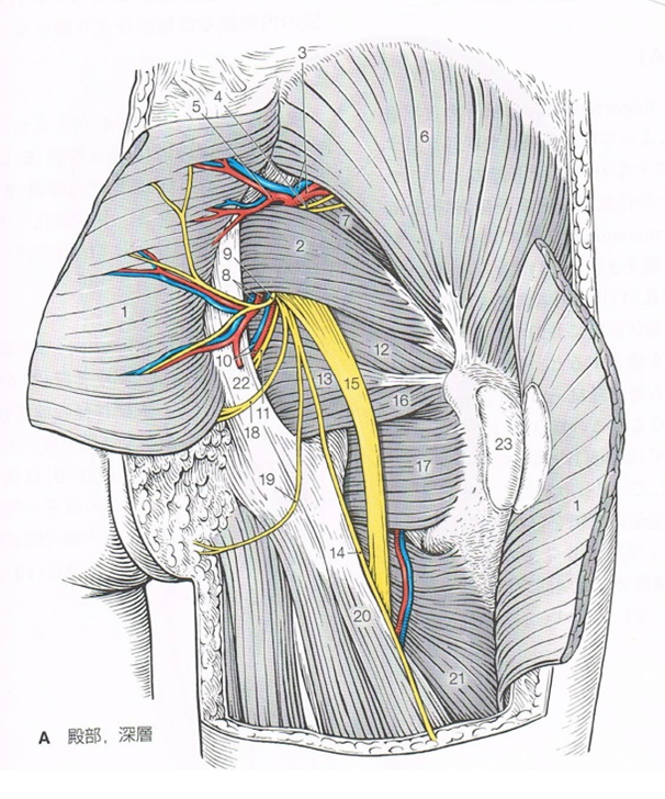 股関節が原因なのに腰痛と勘違いしているまれなケース。股関節(殿筋)まわりには末梢神経で一番太い坐骨神経があり、圧迫される事で激痛を起こします。イラスト中央の黄色いのが坐骨神経です。