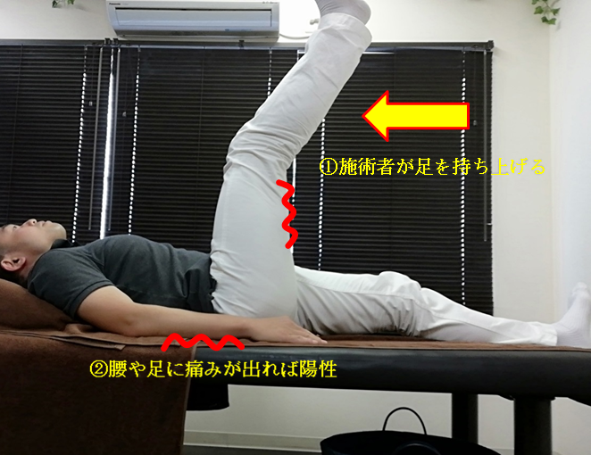 腰骨=腰椎(ようつい)の構造と、椎間板と髄核のイラストです。写真はSLR(ストレートレッグライジング)と呼ばれる検査法です。