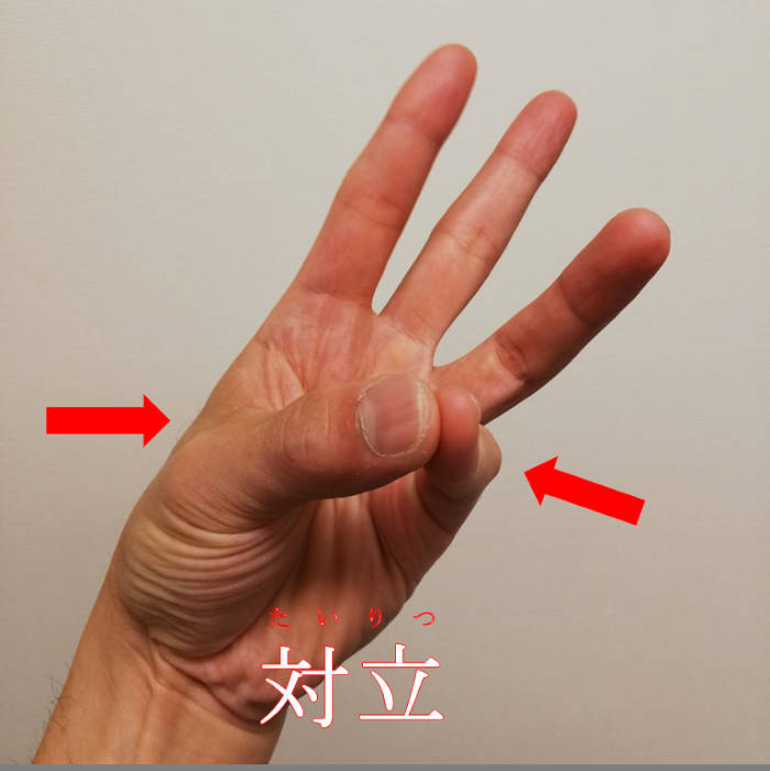 人間の手が他の動物と決定的に違う点は、五本の指を集約させられることです。親指と小指をくっつけ離すことができ(対立と復位)、物が掴めたり複雑な作業ができます。親指が自在に動くことで大脳が発達し、類人猿から高い知能を有する人類へ進化した学説もあります。