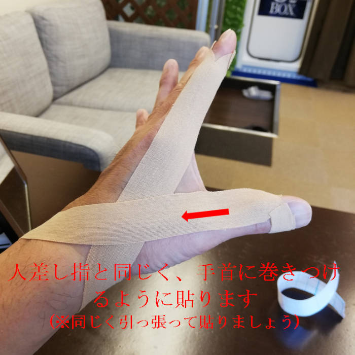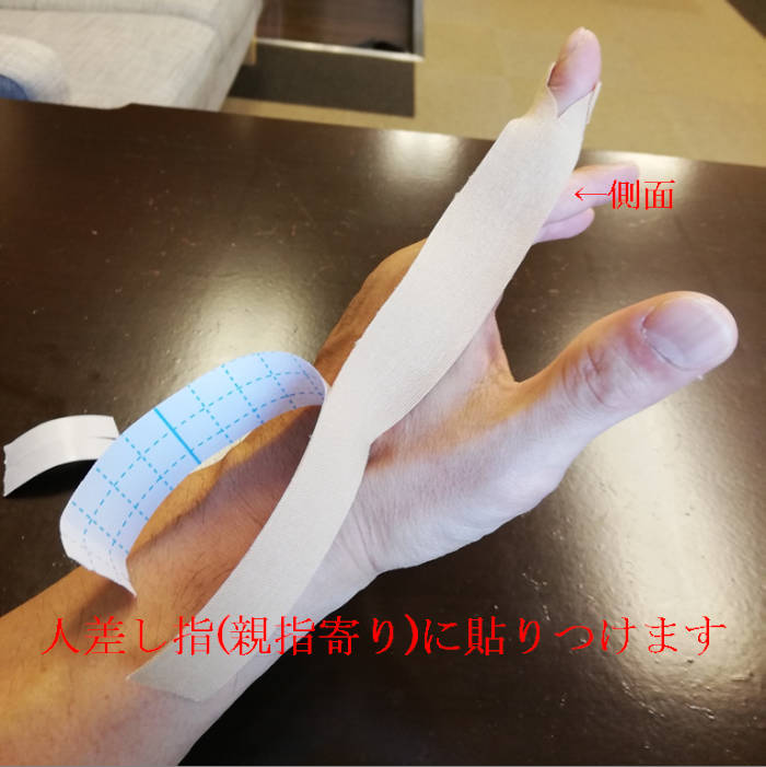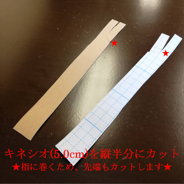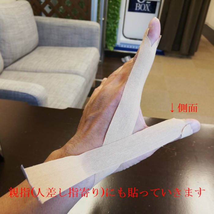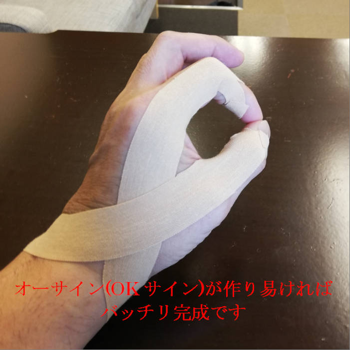 親指と人差し指の動きが悪くなるケースが多いので、サポートしてくれるキネシオテープを紹介します。少し細かく見えますが、図画工作的な観点で行って頂ければと。慣れればそんなに難しくありません。