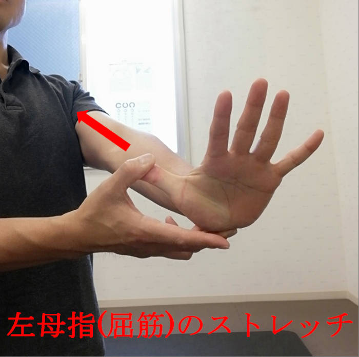 神経系の不調は握力障害が出やすいです。また前腕屈筋群の疲労から発症することもあるので、筋・神経どちらもストレッチを行います。前腕にキネシオを貼りながら行うと更に効果が出せます。