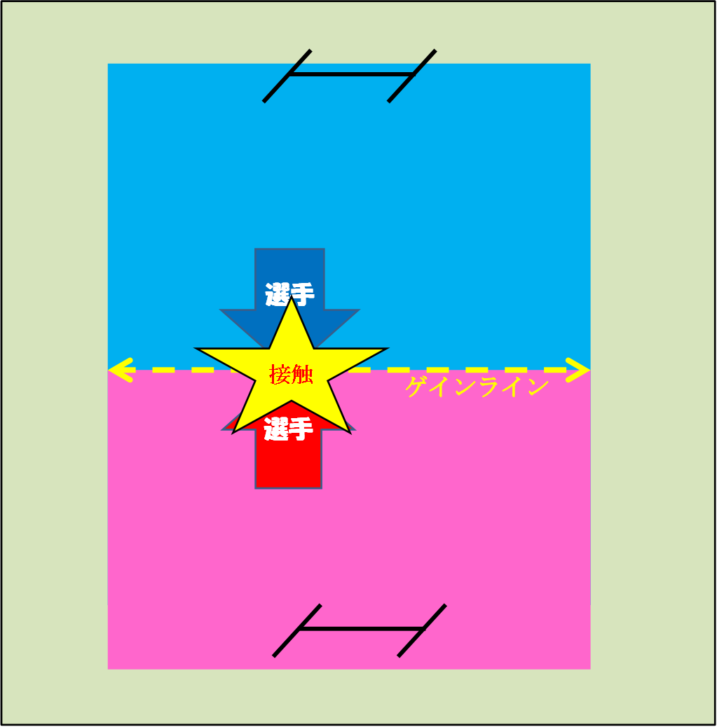 このゲインラインから敵味方お互い前に出られません。前にいる選手は全てオフサイド、もしプレーに参加したら反則です。