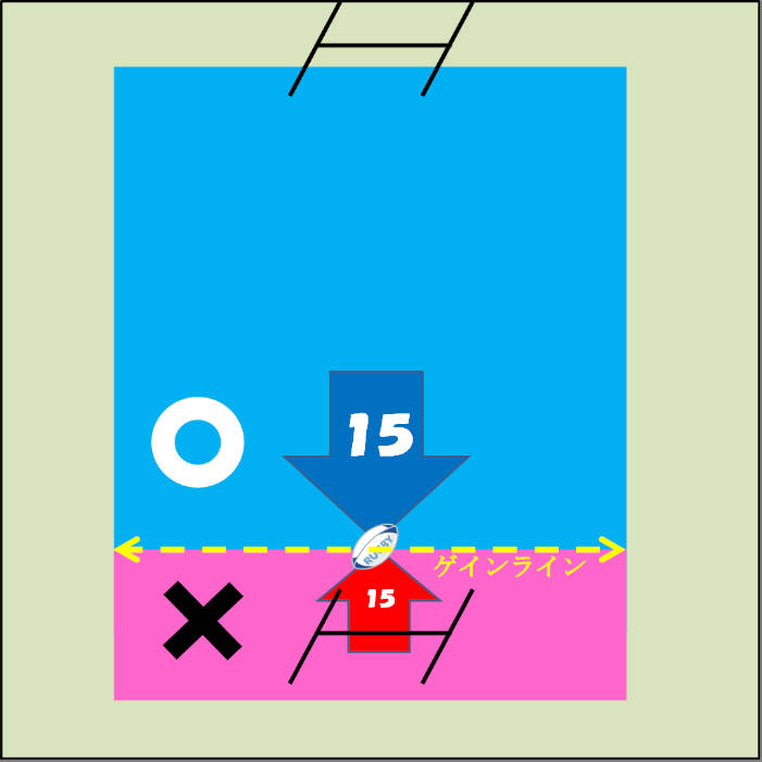 次のイラストのように、赤チームが自軍ゴール際まで下がっていると、お相撲でいう土俵際(-_-;)。ゴール際のミスは青チームにトライチャンスを与えるため、大胆なプレーが出来ません。赤チームは逃げの一手でボールを持っていても不利。反対に青チームは自軍エリアに余裕があるため、大胆に攻めれます。