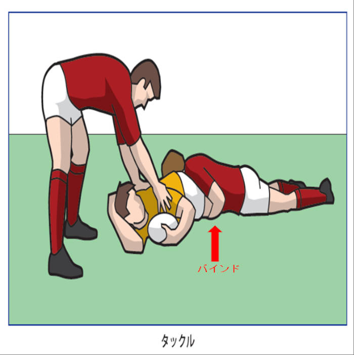 タックルとは、ボールを持った攻撃側選手と防御側の選手が、接触し倒れた状態。相撲のような当たり方は反則で、バインドといって相手を両腕で巻き込まなければいけません。タックル後、選手はすぐにボールを離し、タックラーも相手を離します。お互い立ち上がったら再度プレーに参加OK。倒れた選手(膝が地面に着くのもNG)はプレーに参加できないんです。